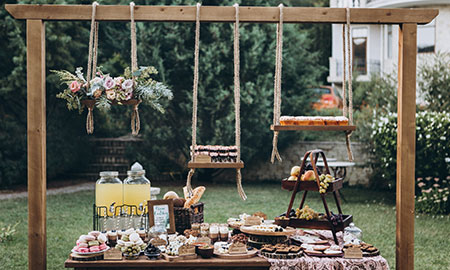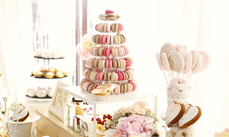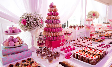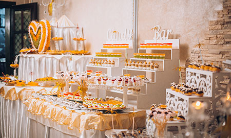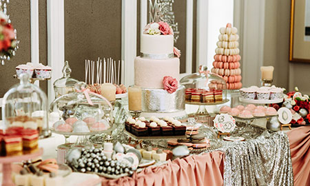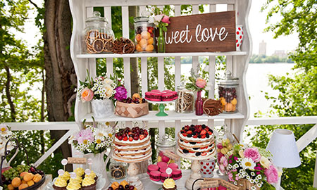 Um Ihrem Hochzeitsbuffet das gewisse Etwas zu verleihen, können Sie auf verschiedene Leckereien zurück greifen. Diese Candy Bar besteht aus vielen kleinen Desserts und hübscher Dekoration.